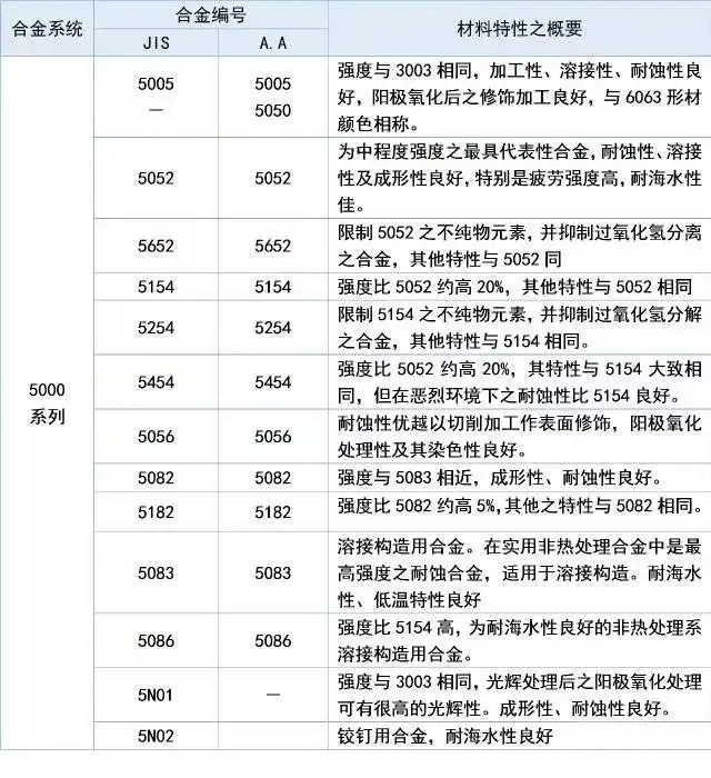 又可以称为铝镁合金。主要特点为密度低,抗拉强度高,延伸率高。在相同面积下铝镁合金的重量低于其他系列,在常规工业中应用也较为广泛。